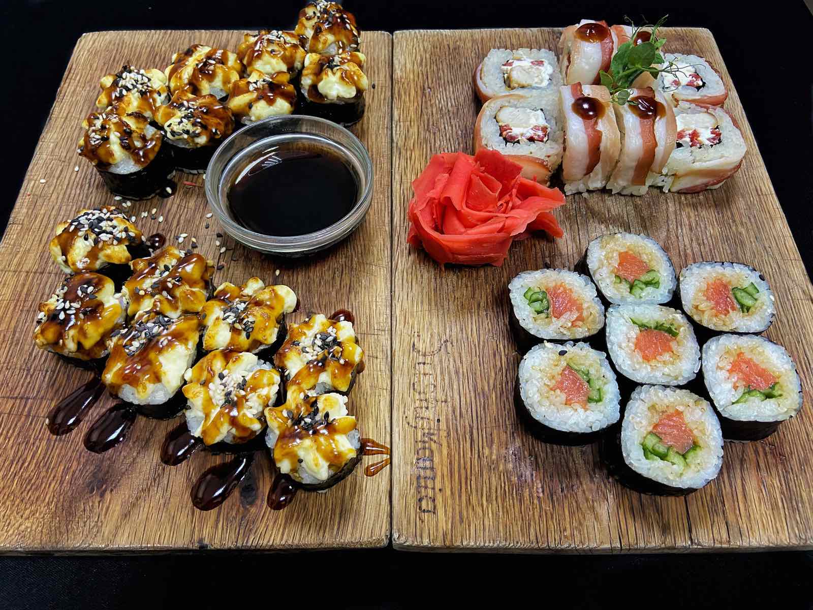Запеченный хосомак с лососем (лосось, сырный соус, рис, нори);